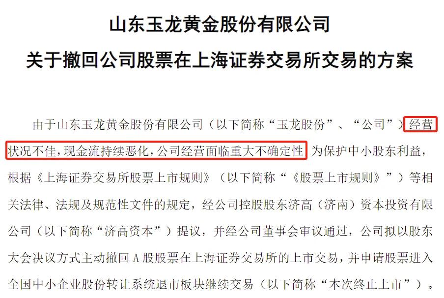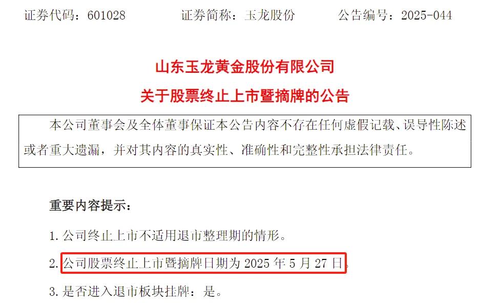 2025年5月20日,玉龙股份收到上海证券交易所作出的《关于山东玉龙黄金股份有限公司股票终止上市的决定》,上交所决定终止公司股票上市。公司股票不进入退市整理期交易,上交所将在公告公司股票终止上市决定之日起5个交易日内,对公司股票予以摘牌、终止上市。