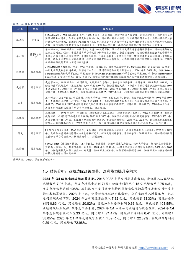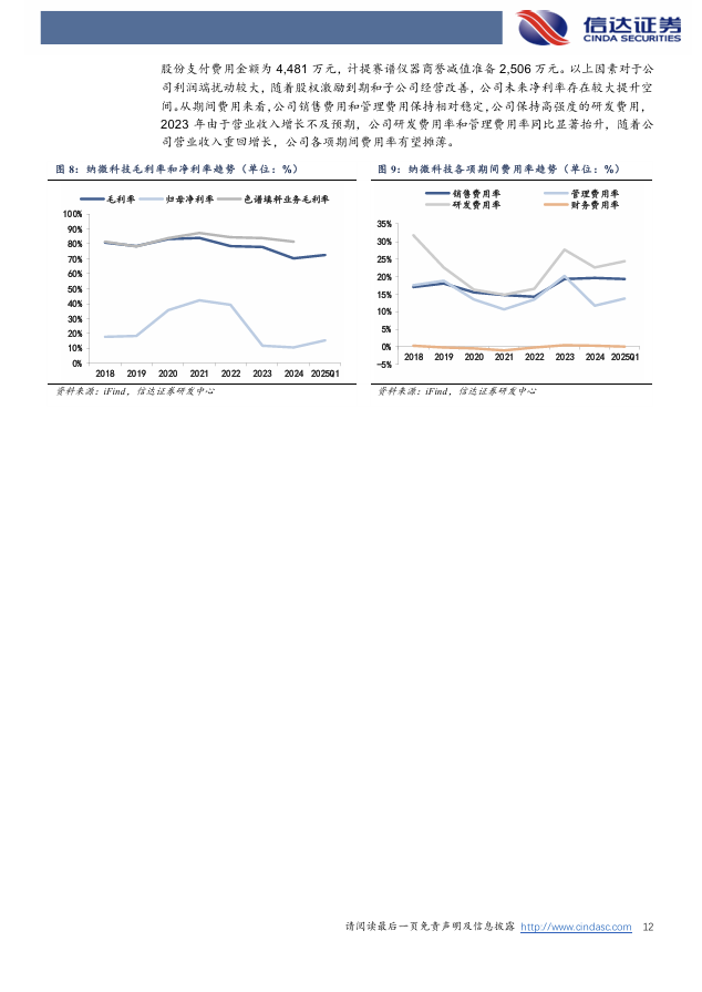 纳微科技成立于2007年,公司专门从事高性能纳米微球材料研发、规模化生产、销售及应用服务,为生物医药、平板显示、分析检测及体外诊断等领域客户提供核心微球材料及相关技术解决方案。2023年以来,受外部宏观环境变化影响,公司业绩陷入增长压力。2024Q4以来公司业绩边际改善显著,2024Q4单季度实现营业收入2.33 亿元,同比增长 71.47%,实现归母净利润0.41亿元,同比增长38.05%;2025Q1单季度实现营业收入1.89亿元,同比增长22.39%;实现归母净利润0.29亿元,同比增长72.98%。2023年以来公司净利率水平大幅下滑,主要是受到股权激励费用摊销和赛谱仪器商誉减值的影响,以上因素对于公司利润端扰动较大,我们认为,随着股权激励到期和子公司经营改善,公司未来净利率存在较大提升空间。