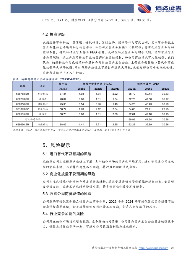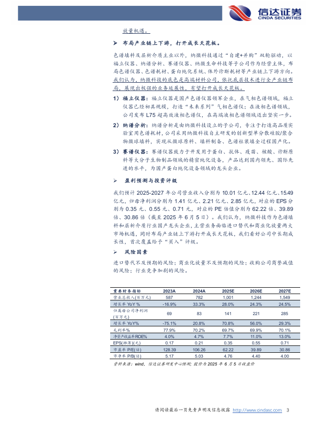 盈利预测与投资评级:我们预计2025-2027年公司营业收入分别为10.01亿元、12.44亿元、15.49亿元,归母净利润分别为1.41亿元、2.21亿元、2.85亿元,对应的EPS分别为0.35元、0.55元、0.71元,对应的PE估值分别为62.22倍、39.89倍、30.86倍(截至2025年6月5日)。我们认为,纳微科技作为色谱填料和层析介质行业国产龙头企业,主营业务面临进口替代和商业化放量两大市场机遇,同时布局产业链上下游打开成长天花板,我们看好公司中长期成长性,首次覆盖给予“买入”评级。
