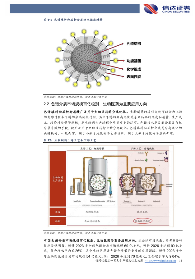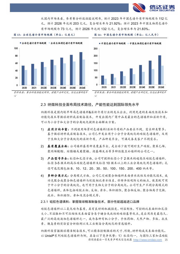 色谱填料和层析介质是生物医药分离纯化的关键耗材,一般而言,用于小分子纯化称为色谱填料,用于大分子纯化称为层析介质。参考赛分科技招股说明书,从全球市场来看,预计2023年全球色谱介质市场规模69亿美元,预计2026年达到90亿美元,复合增长率为9.26%;从国内市场来看,预计2023年中国色谱介质市场规模为112亿元,预计2026年达到203亿元,复合增长率为21.92%。纳微科技是国内较早布局色谱填料和层析介质行业的龙头企业,开发出国内厂商中品类最全的色谱填料和层析介质,可以为小分子和大分子的分离纯化提供全面解决方案。我们认为,公司色谱填料和层析介质主业目前处于关键发展窗口期,有望受益于进口替代和商业化放量两大机遇,具体来看: