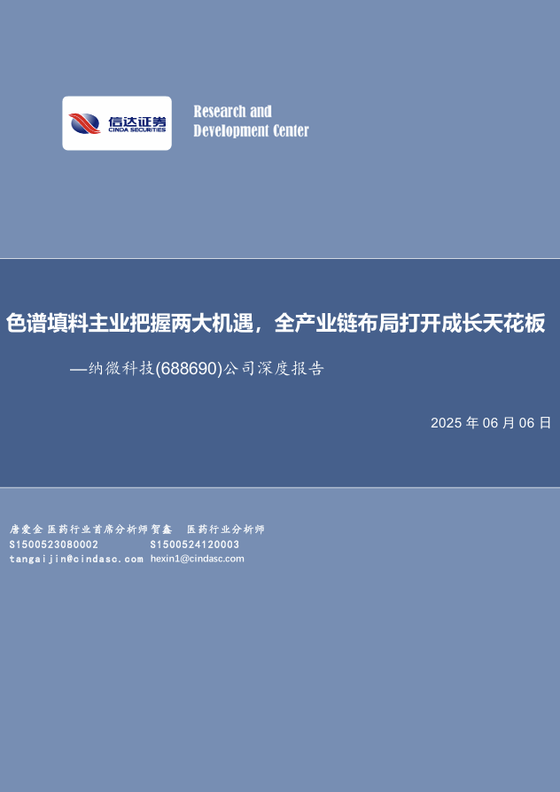 本文来自信达证券研发中心2025年6月6日发布的《纳微科技(688690)公司深度报告:色谱填料主业把握两大机遇,全产业链布局打开成长天花板》欲了解具体内容,请阅读报告原文,唐爱金S1500523080002,贺鑫S1500524120003。