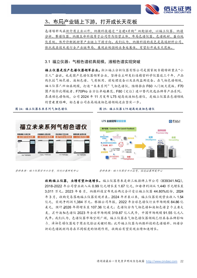 色谱填料及层析介质主业以外,纳微科技通过“自建+并购”双轮驱动,以福立仪器、纳谱分析、赛谱仪器、纳微生命科技等子公司作为经营主体,布局色谱仪器、色谱耗材、蛋白纯化系统、体外诊断耗材等产业链上下游方向。我们认为,纳微科技的底色是高端材料公司,依托底层技术进行全产业链布局,展现出极强的业务延展性,有望打开成长天花板。