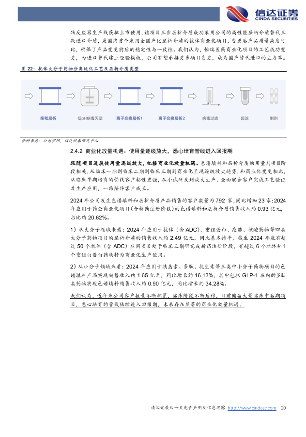 1)进口替代机遇:色谱填料和层析介质行业长期被外资垄断,无论是小分子色谱填料还是大分子层析介质,国产化率都相对较低。近年来伴随着国内生物医药产业的高速发展,国产龙头企业快速崛起,在国际地缘政治关系日益紧张的背景下,自主可控有望成为国内生物医药企业的潜在重要战略。我们认为,公司下游客户恒瑞医药商业化项目的工艺成功变更,为进口替代建立经验模板,公司有望承接更多项目变更,成为国产替代进口的主力军。
