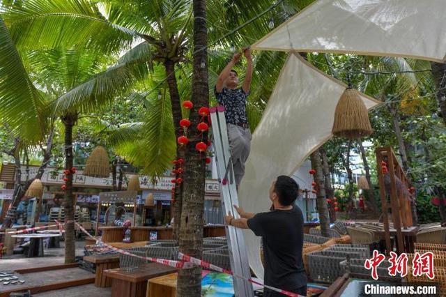 6月12日,今年第1号台风“蝴蝶”逐渐逼近,三亚大东海旅游区一家海边餐厅的工作人员正在做防台风准备工作。 中新网记者 骆云飞 摄