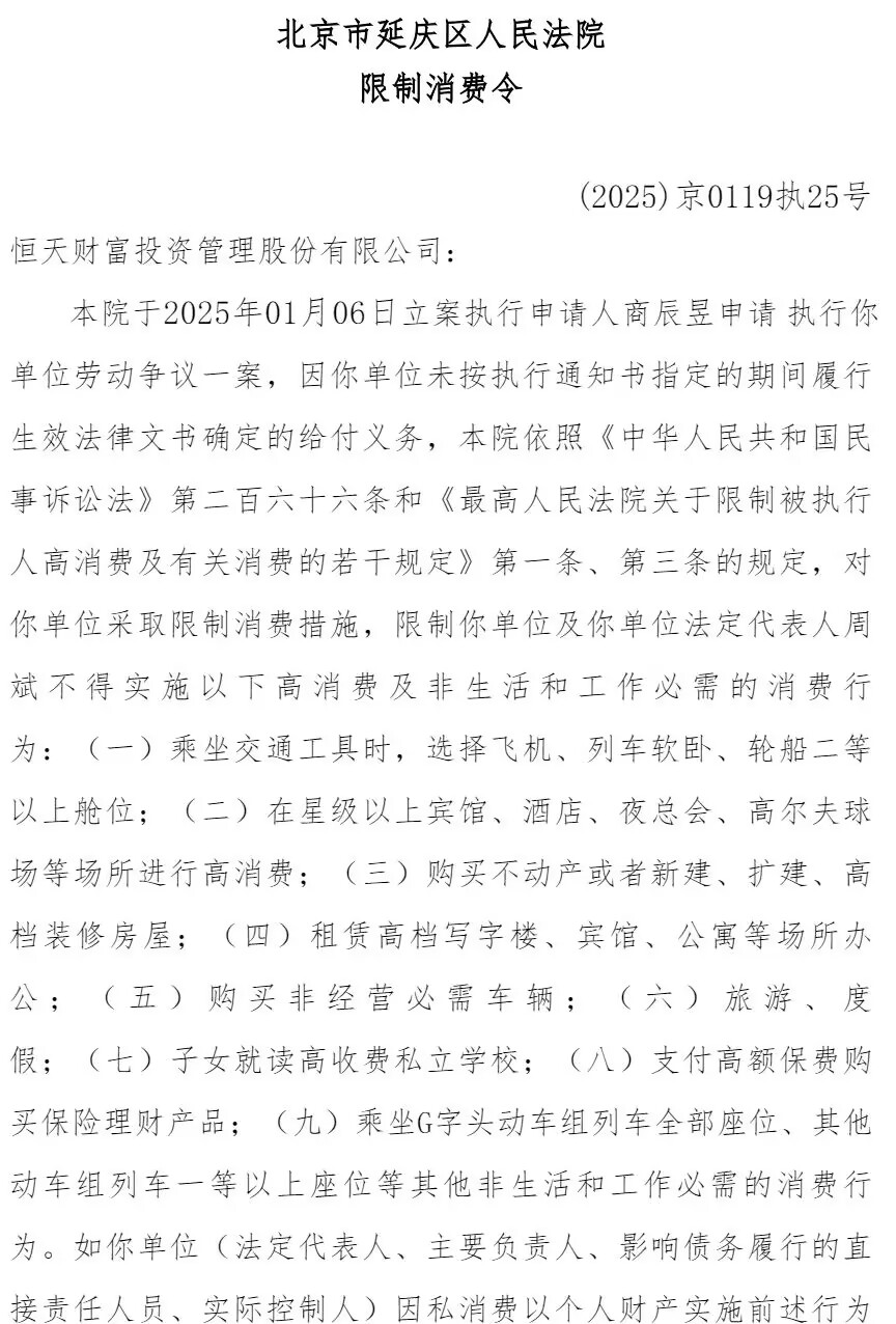 近日,恒天财富投资管理股份有限公司及法人代表周斌因单位劳动争议一案,因单位未按执行通知书指定的期间履行生效法律文书确定的给付义务,被北京市延庆区人民法院发布限制消费令,限制该单位及单位法定代表人周斌不得实施高消费及非生活和工作必需的消费行为。