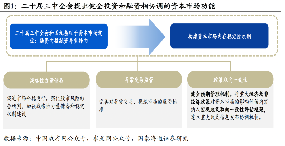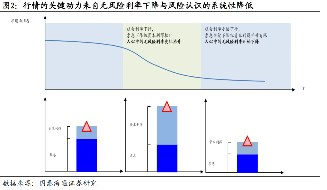 行情的关键动力来自无风险利率下降与风险认识的系统性降低。过去三年内外部过高的机会成本阻碍了投资人的入市意愿,央行互换便利与回购再贷款扫清了股市流动性改善的障碍,长期国债收益破2与存款利率破1,中国股市的无风险利率出现实质性下降。此外,及时、得当与合理的经济政策,查漏补缺更重视投资者回报的资本市场基础制度改革,以及决策者扭转形势与支持资本市场的决心,对于推动经济社会风险评价的降低与改变投资人面对风险的保守态度具有关键意义。以上,增量入市与长期入市进入历史转折点。(图1资料来源为中国政府网公众号,求是网公众号等公开信息)