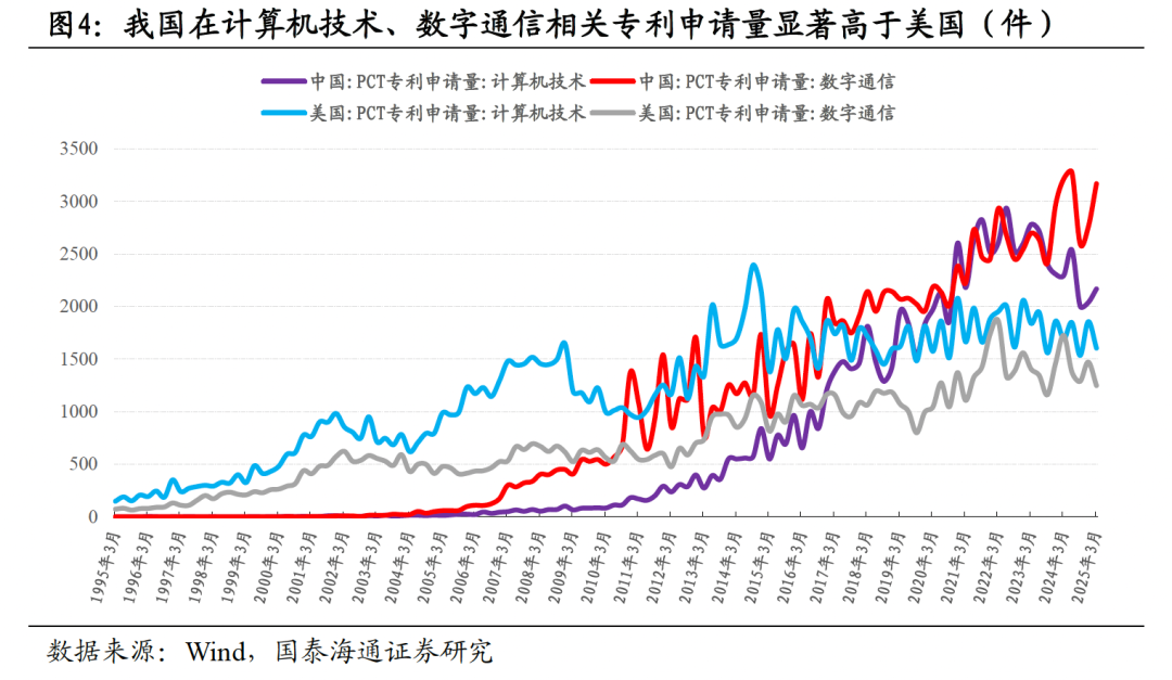 我国新兴科技产业的发展经历着从关键技术突破到大规模应用的跃升,自上而下的政策引领和产业本身的创新势能共同推动科技产业新周期到来。二十届三中全会指出构建支持全面创新体制机制,统筹推进教育科技人才体制机制一体化改革。具体指出必须深入实施科教兴国战略、人才强国战略、创新驱动发展战略,统筹推进教育科技人才体制机制一体改革,健全新型举国体制,提升国家创新体系整体效能。2025年全国两会政府工作报告指出,深入推进战略性新兴产业融合集群发展,开展新技术新产品新场景大规模应用示范行动。基于原创技术、自主可控的发展路径,我国科技产业在多领域迎来“斯普特尼克时刻”。2018年以来,我国PCT专利申请数量显著提升,且超过美国、日本等科技大国,我国PCT专利申请量全球占比已接近30%。从细分专利领域看,我国在数字通讯、计算机技术等代表新一轮信息技术革命的领域专利申请量更为领先。