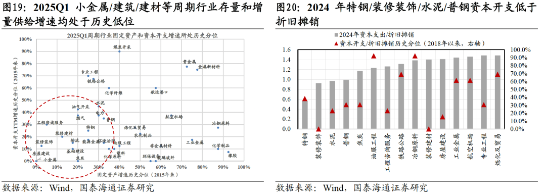 从上市公司口径的供给端来看:地产链(钢铁/建材)和部分工业原料(小金属/焦炭)供给增速处于历史较低区间。2025Q1多数行业增量供给(资本开支TTM增速)已经处于历史偏低水平,但仍有许多行业存量供给(固定资产增速)仍处于历史较高区间。具体而言:地产建筑链(房屋建设/装修装饰/基础建设/装修建材/钢铁)以及部分工业原料(小金属/焦炭/能源金属)存量供给和增量供给都处于历史低位。资本开支收缩的行业主要在地产建筑链(钢铁/水泥/装修装饰),焦炭相对资本支出也处于历史低位。