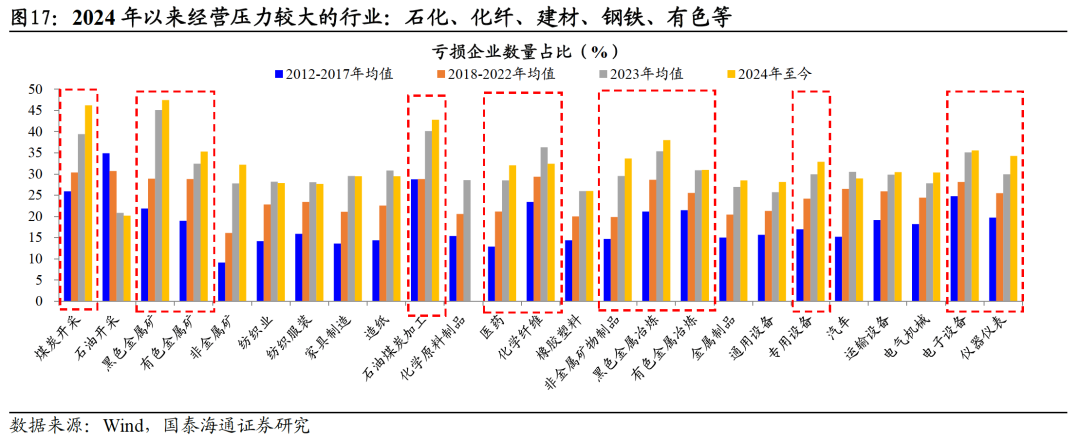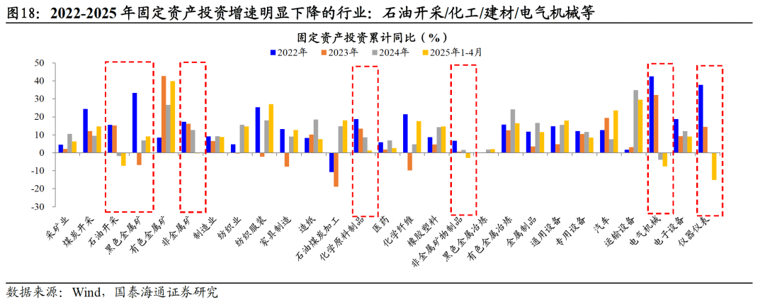 从工业企业口径的供给端来看:在盈利和现金流压力下,化工/有色/建材/钢铁等周期行业供给收缩明显。近几年随着盈利和现金流压力的持续加大,石化、化纤、建材、钢铁、有色等行业亏损企业数量占比明显提升,2024年以来均值超过30%,经营压力居前。我们认为行业经营压力加大将倒逼中小企业加速退出,这将带动行业现有产能出现收缩,从而缓解供需压力。从工业企业的固定资产投资来看,2022-2025年石化、化工、建材、电气机械等行业固定资产投资出现明显下降,我们认为这将有效控制行业新增产能的释放。