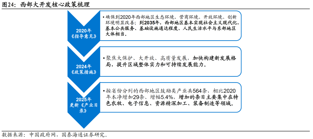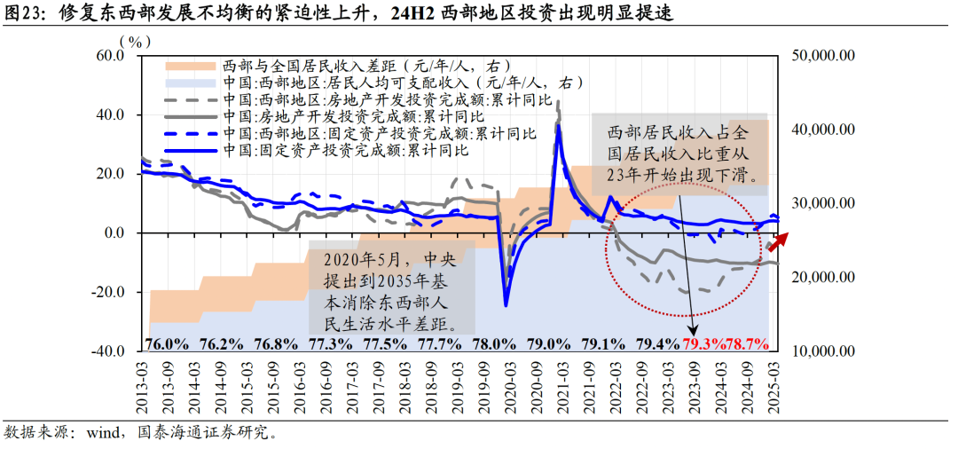 修复地区发展不均衡的紧迫性上升,西部基建投资提速。24年下半年中央再次强调西部大开发,西部地区地产开发和固定资产投资明显提速。看好:受益西部基建投资提速的交运/建材。