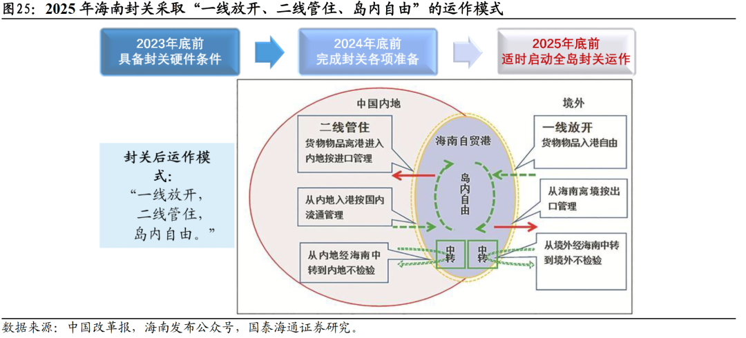 全岛封关将进一步提高贸易自由化,吸引全球投资。2025年底前海南自贸港将适时启动封关,采取“一线放开,二线管住,岛内自由”的运作模式。封关将大幅提高贸易和投资自由度,并显著降低综合税负。投资建议:1)封关后,看好受益于贸易和人员流动自由度全面提升的免税业;2)经贸自由化将催生服务需求增长,叠加封关后岛内税负全面降低,看好围绕贸易自由化展开的航运/旅游/金融等特色服务业。