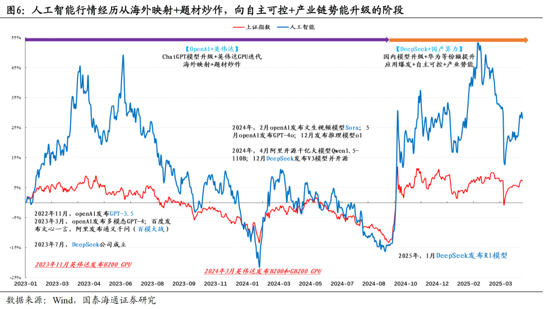 本轮人工智能产业新趋势也呈现出上述阶段性特征,而当前正在经历从海外映射+题材炒作到自主可控+产业链势能的升级阶段。2023年初和2025年初分别走出两波人工智能板块行情,但背后的核心投资逻辑具有显著差异。从2022年11月OpenAI发布GPT-3.5到2023年3月发布GPT-4,全球人工智能产业链迎来一轮全面行情,而国内股市主要以海外映射逻辑为主,如期间OpenAI应用产品、英伟达算力卡的升级是重要的市场预期锚点。2024年,产业层面AI应用和算力的产品迭代仍在继续,但整体人工智能股票行情较为沉闷。2024年四季度,成为新一轮人工智能行情的重要转折点,字节跳动、阿里巴巴、腾讯等科技龙头公司的AI资本开支成为核心投资逻辑,Deepseek R1大模型的发布是重要转折事件,进一步加速行情节奏,自主可控和国产产业链势能成为新的特征。(图5、图6数据和资料来源为Wind、环球网、央视网等公开信息)