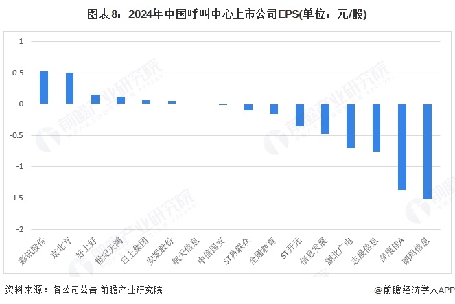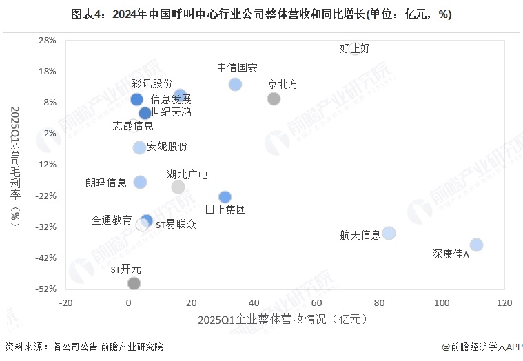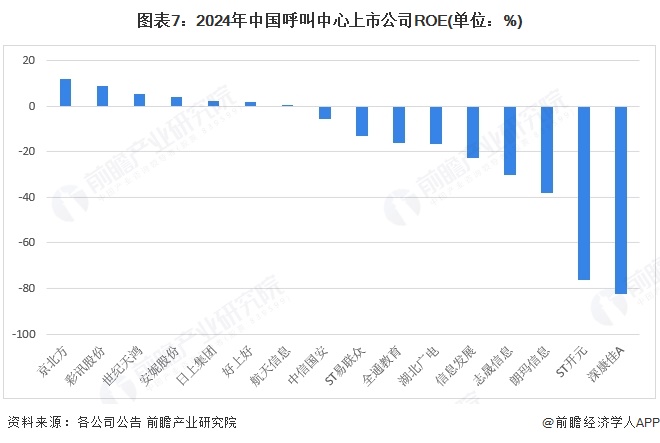 2024年,企业营收表现分化显著。好上好营收72.3亿元,增速达25.24%,增长势头强劲;增速较好的还有中信国安、彩讯股份等企业,保持在10%左右,实现稳健增长。正增长的企业还有京北方、信息发展、世纪天鸿和志晟信息。营收规模较高的是航天信息和深康佳,但是企业营收不乐观,下降幅度较大,分别为-37%和-34%。负增长的企业较多,呼叫中心行业整体经营面临较大压力。