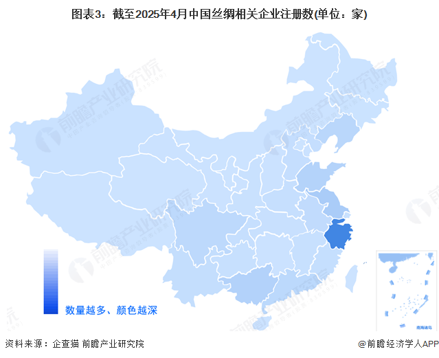 2、中国丝绸产业链区域热力地图:主要集中在浙江、江苏和广西地区通过企查猫,检索“丝绢纺织及印染精加工(国标代码:C174)”行业、登记状态为“存续/在业”的企业,截至2025年4月27日,中国相关企业有3673家,从丝绸产业链代表性企业的区域分布情况来看,主要分布在江浙与广西地区,浙江省内丝绸业企业数量达1488家,排名全国第一,该省丝绸企业数量占比全国近四成;江苏排名第二位,有超300家丝绸制造企业;广西集聚着上游蚕丝生产的企业。