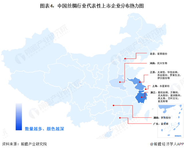 从我国丝绸行业上市企业区域分布上看,浙江省丝绸上市企业最多,代表性企业有嘉欣丝绸、万事利等;江苏省代表性企业主要有太湖雪、华佳丝绸等。国内丝绸上市公司主要集中在江浙地区,其余地区的丝绸上市企业较少。