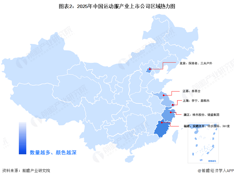 从代表性上市企业分布情况来看,我国运动服的主要10家上市公司,主要集中在沿海和体育消费发达的城市。福建省运动服上市企业数量最多,达3家,且均为知名企业,如安踏体育、特步国际和361度;其次是北京、上海和浙江,各有2家上市公司。