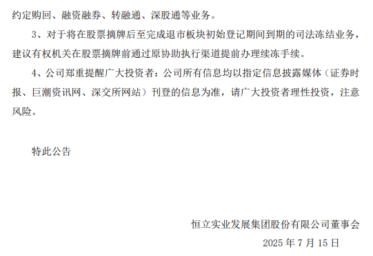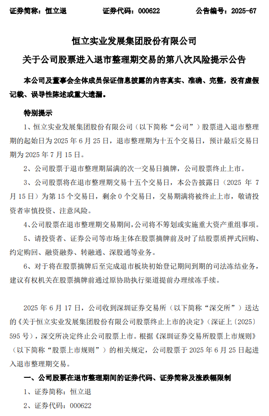 【退市整理】恒立退:关于公司股票进入退市整理期交易的第八次风险提示公告