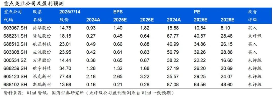 由于AI数据中心电力需求、新能源调峰需求、二氧化碳减排需求等增长带来海外燃气轮机(天然气发电机)订单量的大幅增长,而商用飞机短缺、商用飞机维修需求、军工需求提升等带来飞机发动机订单量的大幅提升,当前,海外两机订单量的快速增长,已经在西门子能源、GE Vernova、三菱重工、GE航空航天、罗罗等年报数据上得到了充分体现。但两机的交付量还受制于交付时长、整机组装、海外高温合金产业链紊乱的影响,没有明显的增长。我们预测,后续两机产业链交付量将得到大幅提升,当前两机主要组装企业已开足马力进行交付,海外高温合金及零部件企业也开始扩能,我们也观察到,海外两机企业也加速引入中国产业链,打破供给瓶颈。我们预测,随着AI数据中心的需求爆发、节能减排要求提升、全球军备需求增长、商业航空航天需求高增,作为前瞻指标的两机订单仍有望维持高增,不排除加速可能,同时,在各方努力下,交付量也会快速提升。中国供应链有望在材料和零部件端受益于这波需求浪潮,铬盐行业是高温合金重要的上游行业,中国铬盐行业处于国际高温合金供应链体系内,需求端的传导非常顺畅,而供给端的刚性有望大幅提升行业的景气;下游高温合金材料企业和零部件企业也将借机切入国际产业链,带来销量和毛利率的快速提升,铬盐、高温合金材料及零部件的国产企业有望受益,建议关注振华股份、隆达股份、航亚科技、应流股份、万泽股份、航宇科技、派克新材、斯瑞新材等企业。