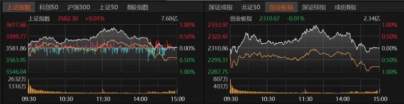 截至收盘,沪指涨0.01%报3582点,盘中一度站上3600点;深证成指跌0.37%;创业板指跌0.01%。两市全天成交1.9万亿元,较前一交易日缩量303亿元,全市场超4000股下跌。