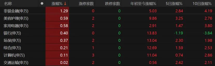 31个申万一级行业板块中,仅有8个飘红。其中,非银金融板块以1.29%的涨幅领先全场,美容护理、家用电器板块也表现不错,嘉亨家化、润本股份、彩虹集团、海立股份涨停。银行、环保、综合、计算机、交通运输板块微涨。