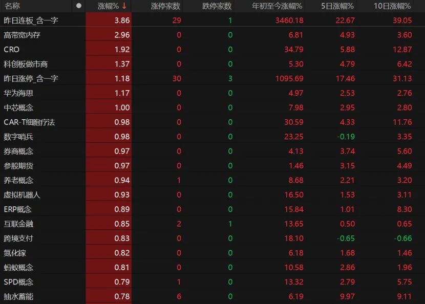概念板块方面,高带宽内存、CRO、科创板做市商、华为海思、中芯概念均表现不错。