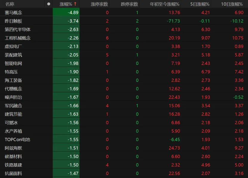 赛马概念跌近5%,第四代半导体、工程机械概念、虚拟电厂、装配建筑板块跌幅超过2%,装配建筑、智能电网、特高压、海工装备、代糖概念、噪声防治、军民融合、建筑节能概念均收跌。