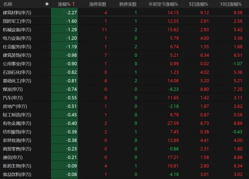 连续大涨两天的建筑材料板块,今日回调2.27%,但仍有韩建河山、华新水泥、西藏天路、北玻股份4只个股涨停。国防军工、机械设备、电力设备、社会服务板块跌幅也超过1%,博云新材、铁建重工、永达股份、法兰泰克、南矿集团、南方路机、中铁工业、雪人集团等个股涨停。建筑装饰板块也回调,但仍有深水规院、筑博设计、设研院、中国电建、中设股份、中岩大地、时空科技7只个股涨停。