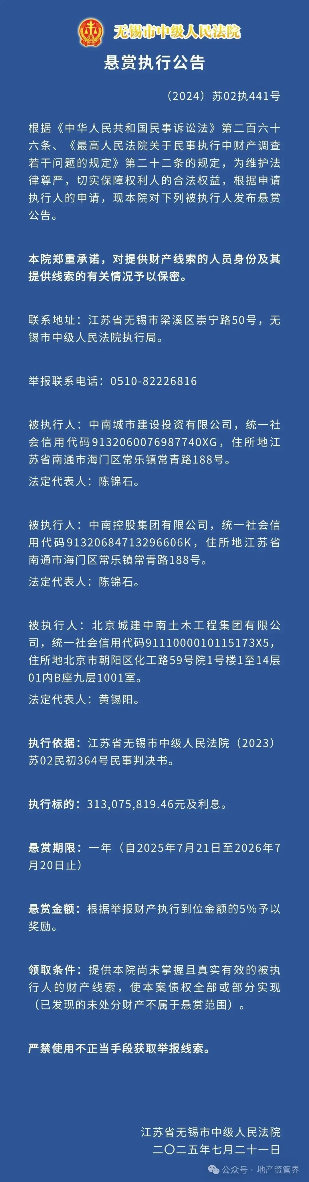 7月21日,无锡市中级人民法院发布悬赏执行公告。根据公告内容,依据江苏省无锡市中级人民法院(2023)苏02民初364号民事判决书,对被执行人中南城市建设投资有限公司、中南控股集团有限公司、北京城建中南土木工程集团有限公司发布悬赏公告,执行标的为313075819.46元及利息,悬赏期限为一年(自2025年7月21日至2026年7月20日止)。