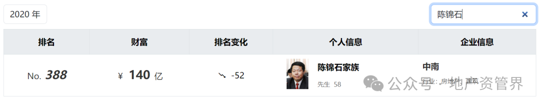 随着中南集团的发展,陈锦石的身家也水涨船高,2008年就登上了《胡润百富榜》,2020年他以140亿元的身家排名第388。