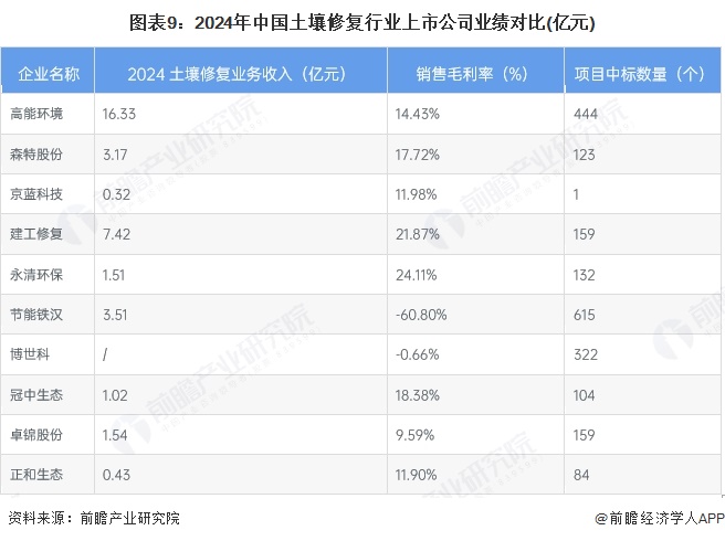 从土壤修复行业上市企业业绩对比来看,2024年高能环境土壤修复业务收入较高,达到16.33亿元,建工修复土壤修复业务收入为7.42亿元。从销售毛利率来看,大多数土壤修复行业企业的销售毛利率水平在15%-25%区间内,一些企业由于2024年经营不善而导致销售毛利率为负,如节能铁汉和博世科。从对企业的项目中标数量情况来看,截至2025年6月,节能铁汉和高能环境的项目中标数量较高,其中节能铁汉项目中标数量高达615项。