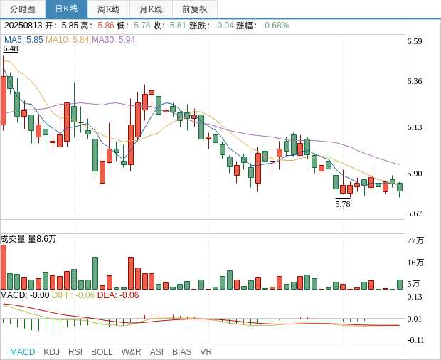 8月13日,万林物流报收5.81元/股,跌0.68%,成交额0.50亿,总市值34.81亿。近七个交易日该公司股价跌幅为0.51%。股权变动可能会对投资者情绪产生一定影响,短期内股价可能会出现波动,但由于减持计划不会改变公司控制权,市场预期可能会逐渐趋于平稳。