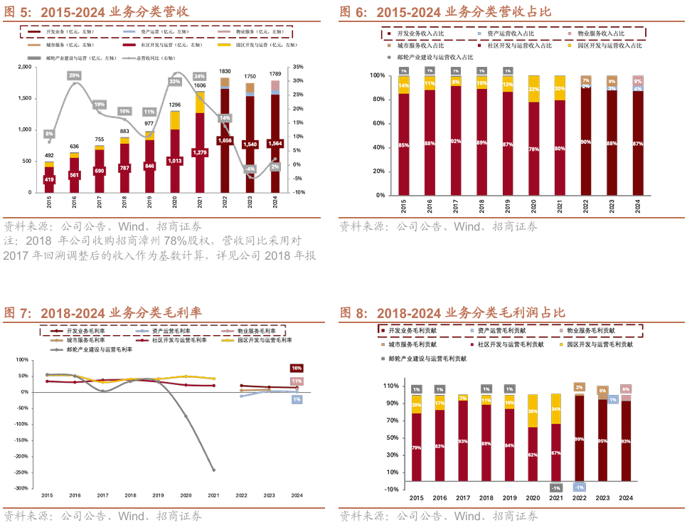 2024年,公司将“城市服务业务”进行拆解:分部内代建业务划分至“开发业务”,邮轮及会展业务划分至“资产运营业务”,物业管理及康养等其余业务则归类为“物业服务业务”。至此,公司业务分类调整为“开发业务”、“资产运营业务”和“物业服务业务”,2024年上述三个业务分类收入占比分别为87%/4%/9%,结构上仍以开发业务收入为主。