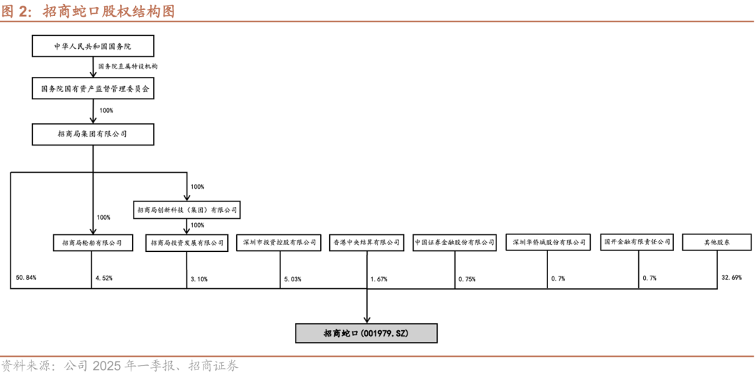 招商蛇口控股股东为招商局集团有限公司(简称“招商局集团”)。截至2025年一季度末,招商局集团直接持有公司50.84%股权,并通过全资子公司招商局轮船有限公司及招商局创新科技(集团)有限公司旗下的招商局投资发展有限公司间接持有公司7.62%的股权。招商局集团合计持股比例58.46%。