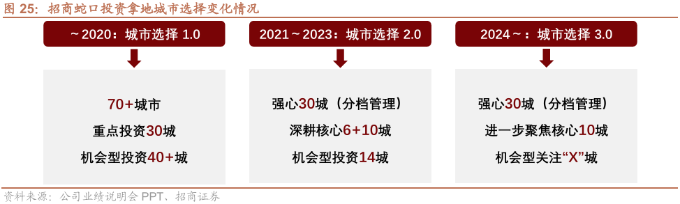 在此阶段,公司的经营策略也经历了从规模扩张向聚焦深耕的转变。在2020年及以前,公司城市布局范围超过70城;2021-2023年,公司在投资端强调区域聚焦、城市深耕,重点投资30城,深耕强心6+10城;2024年,公司进一步聚焦核心10城。