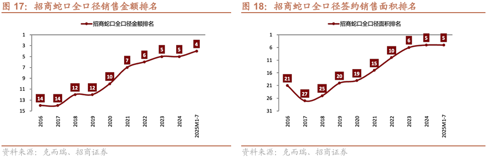 2025年1-7月招商蛇口累计全口径销售金额位居行业第四,近年来公司销售表现优于百强房企。根据公司公告及克而瑞数据,2024年公司全口径销售金额2193亿,位列行业第五;全口径销售面积936万平方米,较2023年提升1名至行业第五。2025年1-7月,招商蛇口全口径销售金额排名较2024年提升1名至行业第四,全口径销售面积排名保持行业第五。
