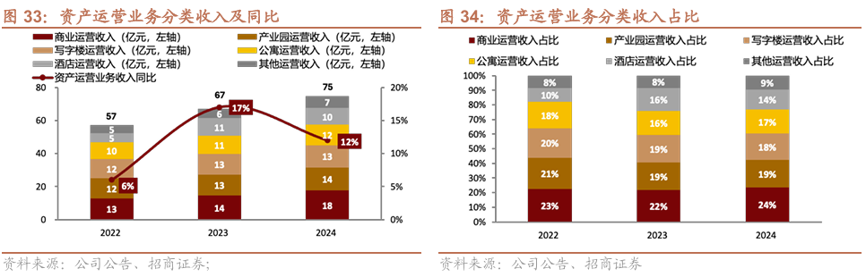 公司资产经营业务收入和利润持续正增长,结构上多元赛道协同发力。自2022年公司业务调整以来,公司资产运营业务收入连续两年正增长,从2022年的57亿增长至2024年的75亿,年化平均增速约14%。从结构上来看,各经营性业态收入占比相对均匀,截至2024年,公司商业/产业园/写字楼/公寓/酒店/其他运营收入在资产经营业务收入中占比分别约为24%/19%/18%/17%/14%/9%。