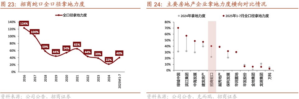 公司拿地力度在2024年有所下降,2025年初以来边际回升,横向对比处于主要房企中上水平。2016年以来公司全口径拿地力度整体呈下降趋势,从2016年的124%下降至2024年的22%,截至2025年7月,公司全口径拿地力度较2024年上升18 PCT至40%。横向对比,招商蛇口全口径拿地力度处于主要房企中上水平。