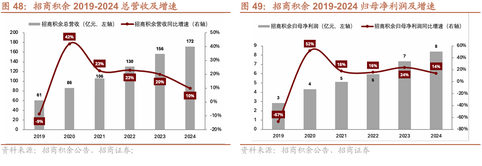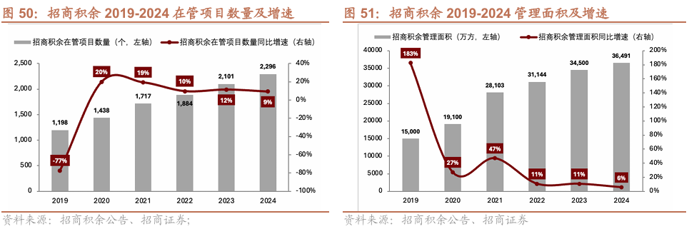 自2019年重组上市以来,招商积余收入和利润均保持增长。招商积余为公司旗下物业服务和轻资产运营服务平台,2019年重组上市以来,公司营业收入和归母净利润均保持增长,其中营收从2019年的61亿增长至2024年的172亿,年化平均增速约为23%,归母净利润从2019年的3亿增长至2024年的8亿,年化平均增速约为24%。管理规模方面,公司管理面积从2019年的1.5亿平方米增长至2024年的3.6亿平方米,年化平均增速约为19%。