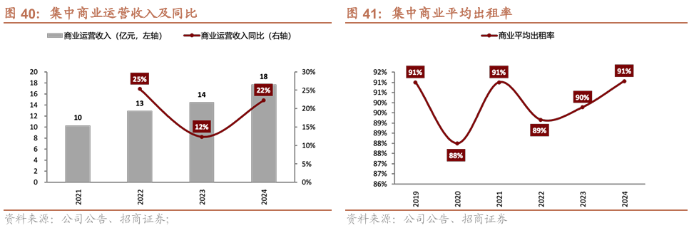 写字楼:收入保持增长,出租率维持70%左右。从收入来看,2022年以来公司集中商业运营收入连续三年正增长,从2021年的7亿增长至2024年的13亿,年化平均增速约26%。出租率方面,2019年以来公司写字楼平均出租率基本稳定于70%左右。