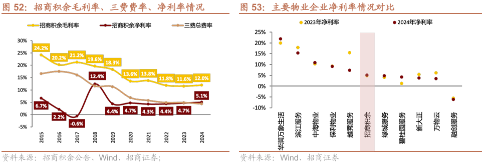 通过组织变革、优化采购体系、构建全生命周期管理体系等措施推动降本增效,净利率稳中有升,降本增效措施持续落地背景下关注公司利润率进一步提升的可能性。2019年重组上市以来,招商积余净利润率保持在5%左右。横向对比来看,招商积余净利率处于主要物业企业中的中等偏低水平,略低于中海物业、保利物业等可比物业央企。近年来,招商积余采取通过组织变革、优化采购体系、构建全生命周期管理体系等一系列降本增效措施,2024年招商积余净利率同比提升0.4 PCT至5.1%。后续随着上述各项降本增效措施持续落地,关注公司利润率进一步提升的可能性。