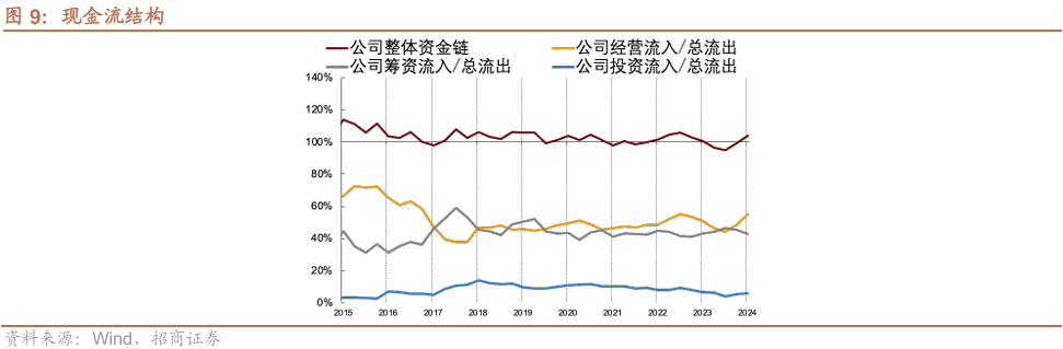 近年来现金流结构以经营性现金流贡献为主,或反映出公司以内生增长为主的稳健经营风格。2015-2016年,公司整体现金流结构以经营性现金流贡献为主,经营性现金流贡献保持在约70%的水平,或体现出公司前期依靠自身积累并增长的稳健经营风格。而后2017-2019年间公司现金流结构发生变化,经营性现金流贡献由2016年的65%下降至2017年的47%,筹资性现金流贡献由2016年的31%上升至2017年的46%。2020年以来,公司现金流结构恢复以经营性现金流贡献为主的结构,经营性现金流贡献占比50%左右,筹资性现金流贡献占比45%左右。