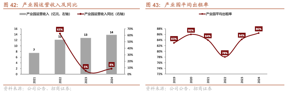 产业园:收入保持增长,出租率基本维持80%以上。从收入来看,2022年以来公司集中商业运营收入连续三年正增长,从2021年的7亿增长至2024年的14亿,年化平均增速约23%。出租率方面,除2022年短暂下滑至78%以外,2019年以来公司产业园平均出租率维持在83%-86%的区间。