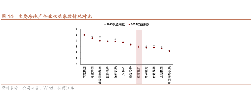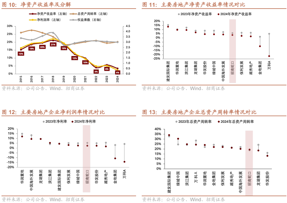 杠杆水平方面,2019年公司权益乘数有明显下降,从2018年3.9的下降至2019年的2.7,主要由于2019年为了完成前海土地整备工作,公司开展资产重组和合资交易,使得少数股权增加带动权益乘数下降。2019-2024年权益乘数平均约3.0。横向对比,公司权益乘数处于主要房企中间水平。