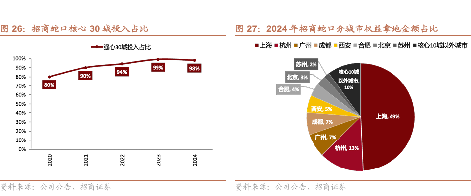 公司投资逐步聚焦,在强心30城基础上进一步聚焦到核心10城。2020年以来, 公司强心 30 城投入占比整体呈上升趋势,从 2020 年的 80%上升至 2024 年 98%。2024年核心10城投入占比就达到90%,其中上海投入金额达49%。