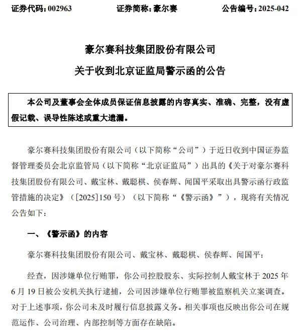 8月20日,豪尔赛科技集团股份有限公司(002963)发布《关于收到北京证监局警示函的公告》。公司于近日收到北京证监局出具的《关于对豪尔赛科技集团股份有限公司、戴宝林、戴聪棋、侯春辉、闻国平采取出具警示函行政监管措施的决定》,经查,因涉嫌单位行贿罪,你公司控股股东、实际控制人戴宝林于2025年6月19日被公安机关执行逮捕,公司因涉嫌单位行贿罪被监察机关立案调查。对于上述事项,豪尔赛未及时履行信息披露义务,被北京证监局采取警示函行政监管措施。实控人戴宝林先生,1965年5月出生,本科学历,国家一级注册照明设计师。