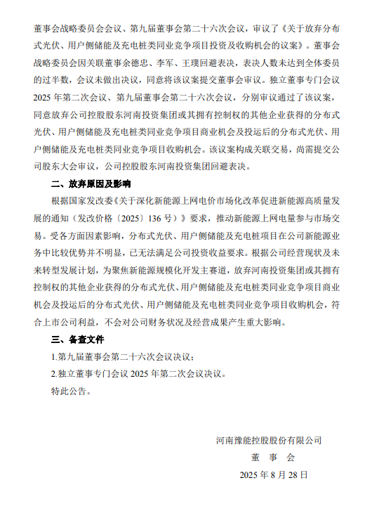 根据公司经营现状及未来转型发展计划,为聚焦新能源规模化开发主赛道,放弃河南投资集团或其拥有控制权的其他企业获得的分布式光伏、用户侧储能及充电桩类同业竞争项目商业机会及投运后的分布式光伏、用户侧储能及充电桩类同业竞争项目收购机会,符合上市公司利益,不会对公司财务状况及经营成果产生重大影响。