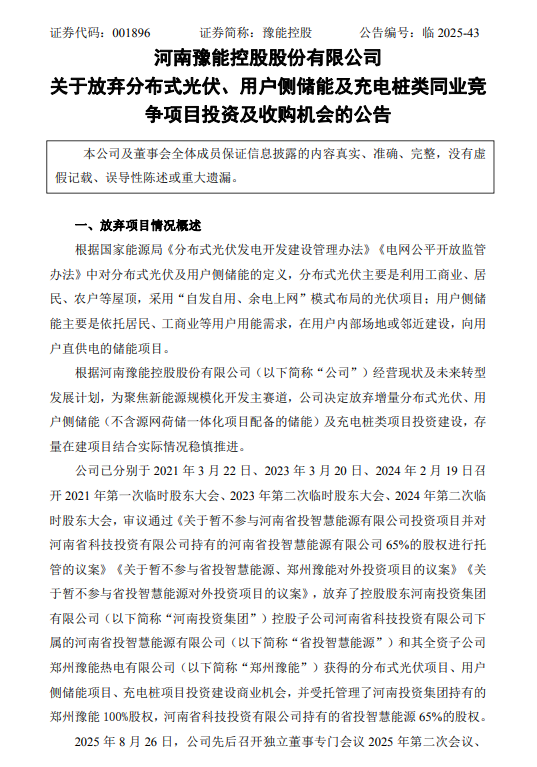 8月27日,豫能控股公告称,根据公司经营现状及未来转型发展计划,为聚焦新能源规模化开发主赛道,公司决定放弃增量分布式光伏、用户侧储能(不含源网荷储一体化项目配备的储能)及充电桩类项目投资建设,存量在建项目结合实际情况稳慎推进。