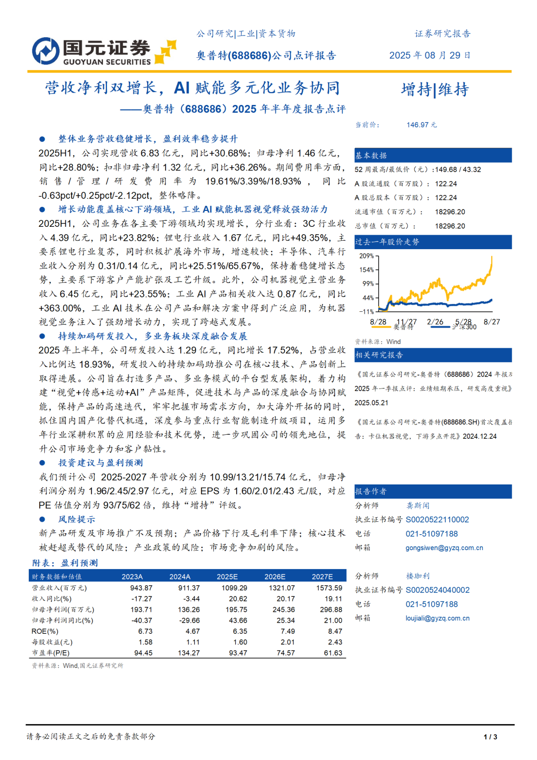 本报告摘自国元证券2025年9月1日已发布的《营收净利双增长,AI赋能多元化业务协同——奥普特(688686)2025年半年度报告点评》,具体报告及分析内容请详见报告。若因对报告的摘编等产生歧义,应以报告发布当日的完整内容为准。