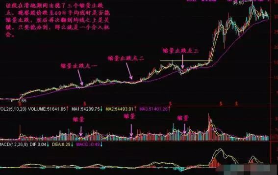 我们把5日、10日均线靠近60日均线称为 “缩量止跌点” ,在一个大牛股的滑跑过程中,有时会出现第一 “缩量止跌点” ,第二 “缩量止跌点” ,甚至第三第四 “缩量止跌点” ,这都是买入的机会。
