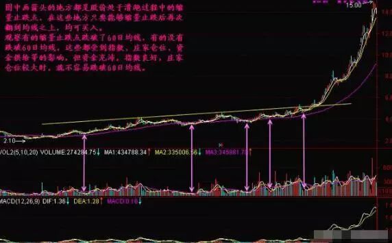 所以,当股价跌到60日平均线附近时,可以观察其成交量是否极其萎缩,股价能否在这里翘头向上,并发生金叉,如果是的话,这里是较好的买入点。